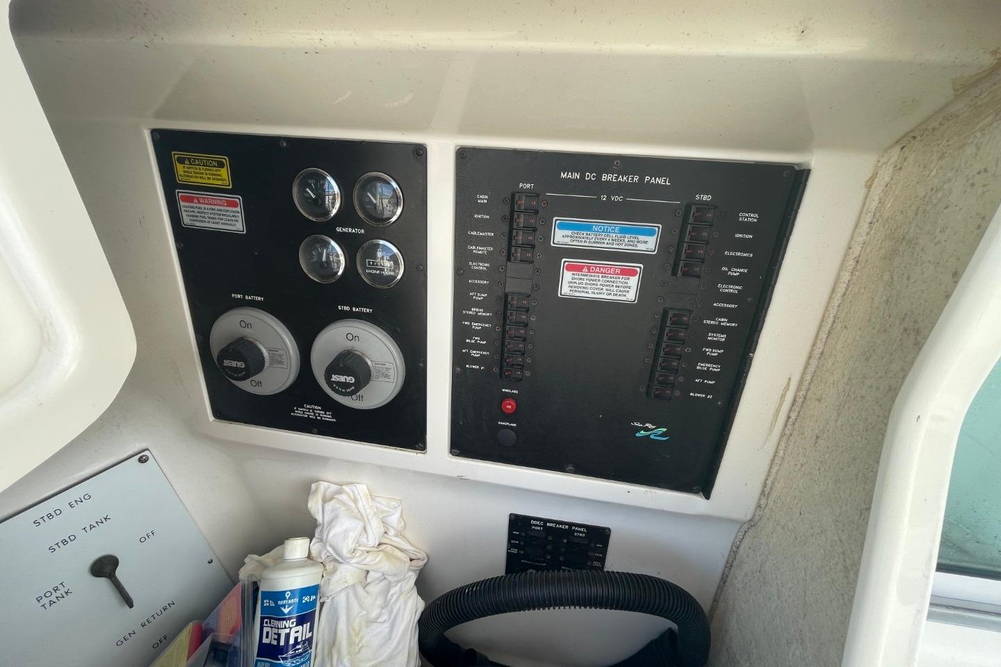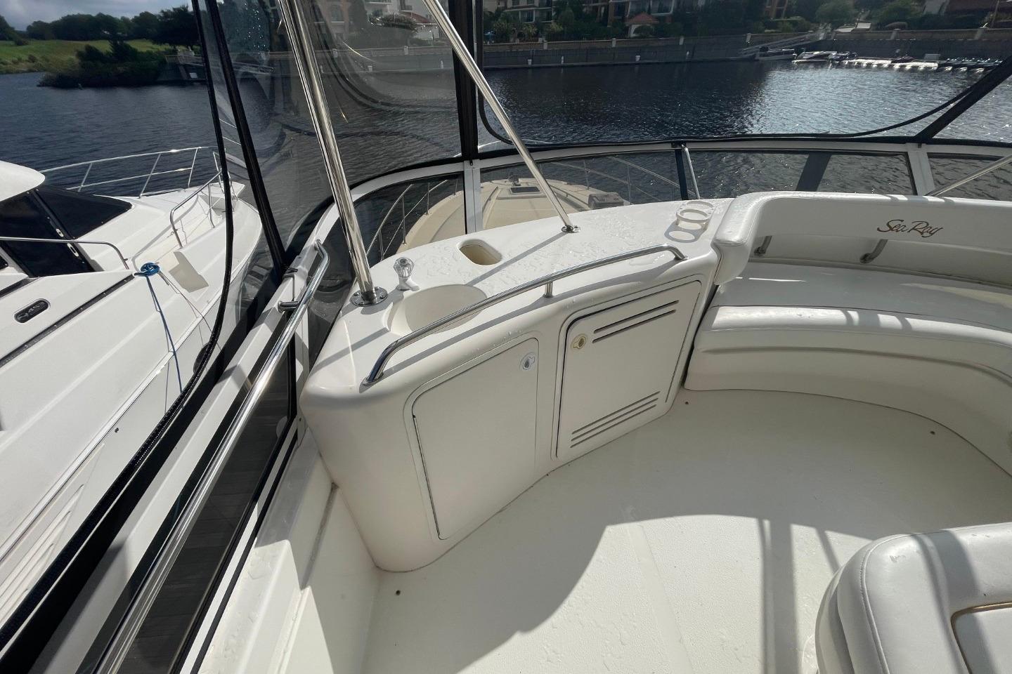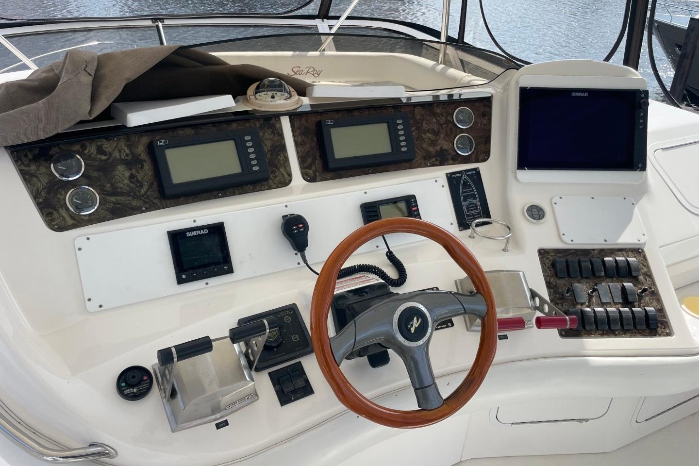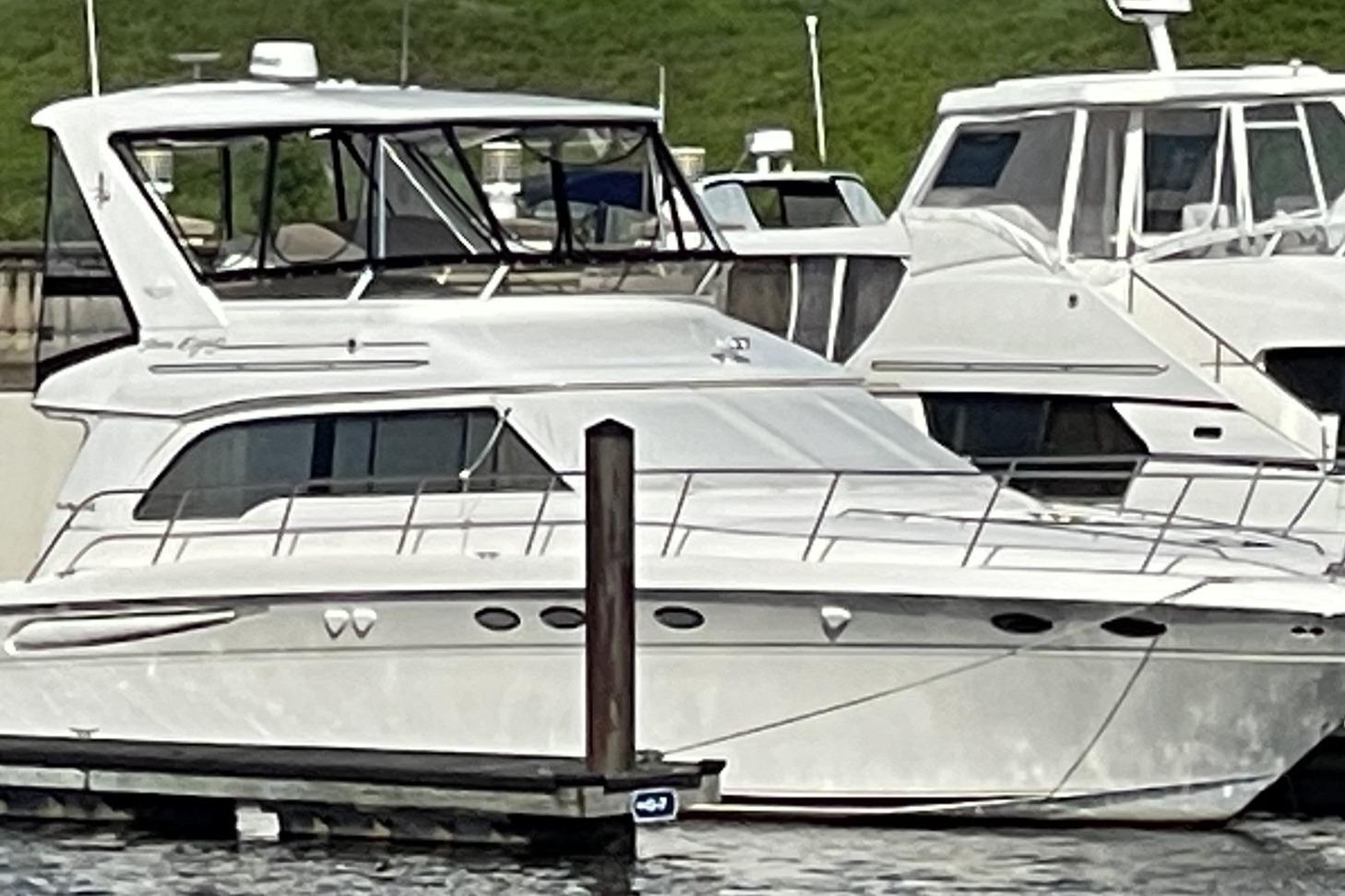 1998 Sea Ray 480 Sedan Bridge yacht docked at marina, surrounded by other boats. • 1998 Sea Ray 480 Sedan Bridge yacht docked at marina, side view. • 1998 Sea Ray 480 Sedan Bridge yacht docked at marina, rear view. • 1998 Sea Ray 480 Sedan Bridge yacht docked at marina, rear view. • 1998 Sea Ray 480 Sedan Bridge yacht docked at marina, overcast sky. • 1998 Sea Ray 480 Sedan Bridge yacht docked at marina, rear view. • 1998 Sea Ray 480 Sedan Bridge yacht docked at marina, rear view. • 1998 Sea Ray 480 Sedan Bridge yacht docked at marina under blue sky. • 1998 Sea Ray 480 Sedan Bridge yacht deck with seating, docked by a marina. • 1998 Sea Ray 480 Sedan Bridge helm with Simrad electronics and wooden steering wheel. • 1998 Sea Ray 480 Sedan Bridge interior with white seating and colorful cushions. • 1998 Sea Ray 480 Sedan Bridge yacht with spacious deck and seating, docked by a bridge. • 1998 Sea Ray 480 Sedan Bridge yacht docked, rear view with "Double Kick Back" name. • 1998 Sea Ray 480 Sedan Bridge yacht with enclosed flybridge under a blue sky. • 1998 Sea Ray 480 Sedan Bridge interior with covered seating, overlooking marina and waterfront buildings. • Interior view of a 1998 Sea Ray 480 Sedan Bridge yacht with waterway backdrop. • Interior view of 1998 Sea Ray 480 Sedan Bridge yacht overlooking marina. • 1998 Sea Ray 480 Sedan Bridge interior with white leather seats at marina. • 1998 Sea Ray 480 Sedan Bridge yacht interior with white seating and waterfront view. • 1998 Sea Ray 480 Sedan Bridge yacht interior with seating and water view. • Isotherm refrigerator on a 1998 Sea Ray 480 Sedan Bridge yacht. • 1998 Sea Ray 480 Sedan Bridge interior with white seating and helm area. • 1998 Sea Ray 480 Sedan Bridge interior with white seating and marina view. • 1998 Sea Ray 480 Sedan Bridge yacht docked at marina, sunny day. • 1998 Sea Ray 480 Sedan Bridge boat with white seating and dock view. • Anchor windlass on 1998 Sea Ray 480 Sedan Bridge boat deck. • 1998 Sea Ray 480 Sedan Bridge anchor system on deck, with stainless steel railings. • Open storage compartment on 1998 Sea Ray 480 Sedan Bridge boat with coiled rope inside. • 1998 Sea Ray 480 Sedan Bridge yacht docked at marina under blue sky. • 1998 Sea Ray 480 Sedan Bridge control panel with gauges and cleaning supplies. • Storage compartment on a 1998 Sea Ray 480 Sedan Bridge with cleaning tools and faucet. • Control panel of a 1998 Sea Ray 480 Sedan Bridge yacht with switches and gauges. • Main distribution panel of 1998 Sea Ray 480 Sedan Bridge yacht, showing AC and DC controls. • 1998 Sea Ray 480 Sedan Bridge interior with branded bags and folding chairs. • Interior of 1998 Sea Ray 480 Sedan Bridge with beige seating and table. • Luxurious interior of 1998 Sea Ray 480 Sedan Bridge yacht with plush seating and elegant decor. • Luxurious interior of a 1998 Sea Ray 480 Sedan Bridge yacht with elegant seating and modern amenities. • 1998 Sea Ray 480 Sedan Bridge interior with kitchen and dining area. • Stovetop on 1998 Sea Ray 480 Sedan Bridge yacht, featuring three burners and control knobs. • Interior view of 1998 Sea Ray 480 Sedan Bridge yacht's dual refrigerators. • Kitchen sink area in 1998 Sea Ray 480 Sedan Bridge yacht, featuring faucet and soap dispenser. • Sharp Carousel convection microwave in 1998 Sea Ray 480 Sedan Bridge kitchen. • Control panel on 1998 Sea Ray 480 Sedan Bridge yacht interior. • Luxurious interior of 1998 Sea Ray 480 Sedan Bridge yacht with comfortable seating. • 1998 Sea Ray 480 Sedan Bridge interior cabin with beige seating and decorative pillow. • Cozy cabin interior of 1998 Sea Ray 480 Sedan Bridge with soft lighting and bedding. • Washing machine inside 1998 Sea Ray 480 Sedan Bridge yacht cabin. • Luxurious 1998 Sea Ray 480 Sedan Bridge yacht bedroom with elegant bedding and ambient lighting. • Luxurious 1998 Sea Ray 480 Sedan Bridge cabin with cozy bed and vintage TV. • Wooden storage cabinet with folded towels and a pillow on a Sea Ray 480 Sedan Bridge. • Thermostat control panel on 1998 Sea Ray 480 Sedan Bridge yacht interior. • 1998 Sea Ray 480 Sedan Bridge bathroom with sink, toilet, and shower. • Bathroom interior of 1998 Sea Ray 480 Sedan Bridge yacht, featuring shower and toilet. • Luxurious bedroom interior of 1998 Sea Ray 480 Sedan Bridge yacht. • Interior cabin storage on 1998 Sea Ray 480 Sedan Bridge yacht. • Luxurious bathroom in 1998 Sea Ray 480 Sedan Bridge yacht, featuring shower and vanity. • Bathroom interior of 1998 Sea Ray 480 Sedan Bridge yacht, featuring toilet and shower. • Luxurious bathroom in 1998 Sea Ray 480 Sedan Bridge yacht, featuring elegant fixtures and ample storage. • Control panel on a 1998 Sea Ray 480 Sedan Bridge yacht interior. • Open cabinet with wooden shelves inside a 1998 Sea Ray 480 Sedan Bridge yacht. • Closet with red jackets and blankets inside a 1998 Sea Ray 480 Sedan Bridge. • Interior of 1998 Sea Ray 480 Sedan Bridge yacht with carpeted stairs and cozy cabins. • Cabinet with Samsung TV and remote controls on a 1998 Sea Ray 480 Sedan Bridge. • 1998 Sea Ray 480 Sedan Bridge audio system with Clarion stereo and components. • Luxurious kitchen interior of 1998 Sea Ray 480 Sedan Bridge yacht. • Luxurious interior of a 1998 Sea Ray 480 Sedan Bridge yacht with modern kitchen and seating. • Luxurious interior of 1998 Sea Ray 480 Sedan Bridge yacht with elegant seating and kitchen area. • Interior view of 1998 Sea Ray 480 Sedan Bridge yacht, showing deck and bridge outside. • Luxurious interior of 1998 Sea Ray 480 Sedan Bridge yacht with modern furnishings. • Control panel of a 1998 Sea Ray 480 Sedan Bridge with Simrad display. • 1998 Sea Ray 480 Sedan Bridge dashboard with navigation instruments and communication devices. • Control panel of a 1998 Sea Ray 480 Sedan Bridge with Detroit Diesel electronic controls. • VHF radio