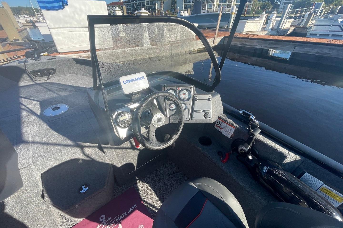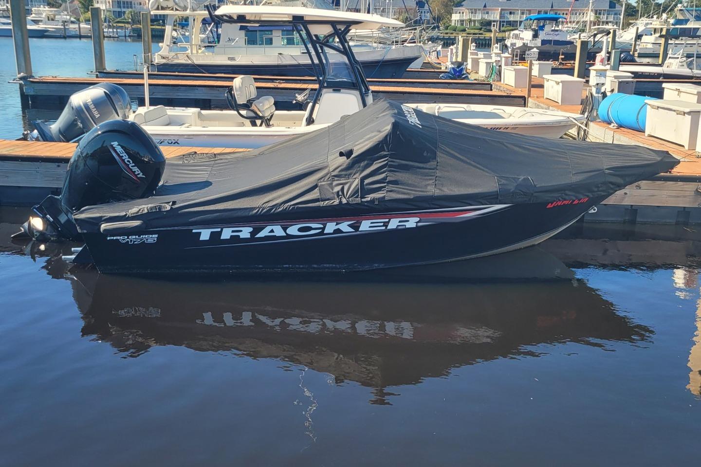 2025 Tracker Pro Guide V-175 Combo dashboard with gauges and controls. • 2025 Tracker Pro Guide V-175 Combo boat interior with seating and controls at a marina. • 2025 Tracker Pro Guide V-175 Combo boat with trolling motor at dock. • 2025 Tracker Pro Guide V-175 Combo boat interior with seats, motor, and dock view. • 2025 Tracker Pro Guide V-175 Combo boat interior with steering wheel and seating. • 2025 Tracker Pro Guide V-175 Combo capacity label, 6 persons or 838 lbs, 150 HP motor. • Battery compartment of 2025 Tracker Pro Guide V-175 Combo boat with Interstate battery. • 2025 Tracker Pro Guide V-175 Combo boat storage compartments with battery and yellow container. • Open storage compartment in 2025 Tracker Pro Guide V-175 Combo boat. • Life jacket stored in a 2025 Tracker Pro Guide V-175 Combo boat compartment. • Open storage compartment in 2025 Tracker Pro Guide V-175 Combo boat. • 2025 Tracker Pro Guide V-175 Combo boat interior with seating and carpeted floor. • Storage compartment in 2025 Tracker Pro Guide V-175 Combo with tools and accessories. • 2025 Tracker Pro Guide V-175 Combo boat interior with storage compartment and fishing gear. • 2025 Tracker Pro Guide V-175 Combo boat interior with motor, docked on calm water. • 2025 Tracker Pro Guide V-175 Combo boat with coiled rope on deck. • Orange electrical adapter on wooden deck, sunlight casting shadows. •